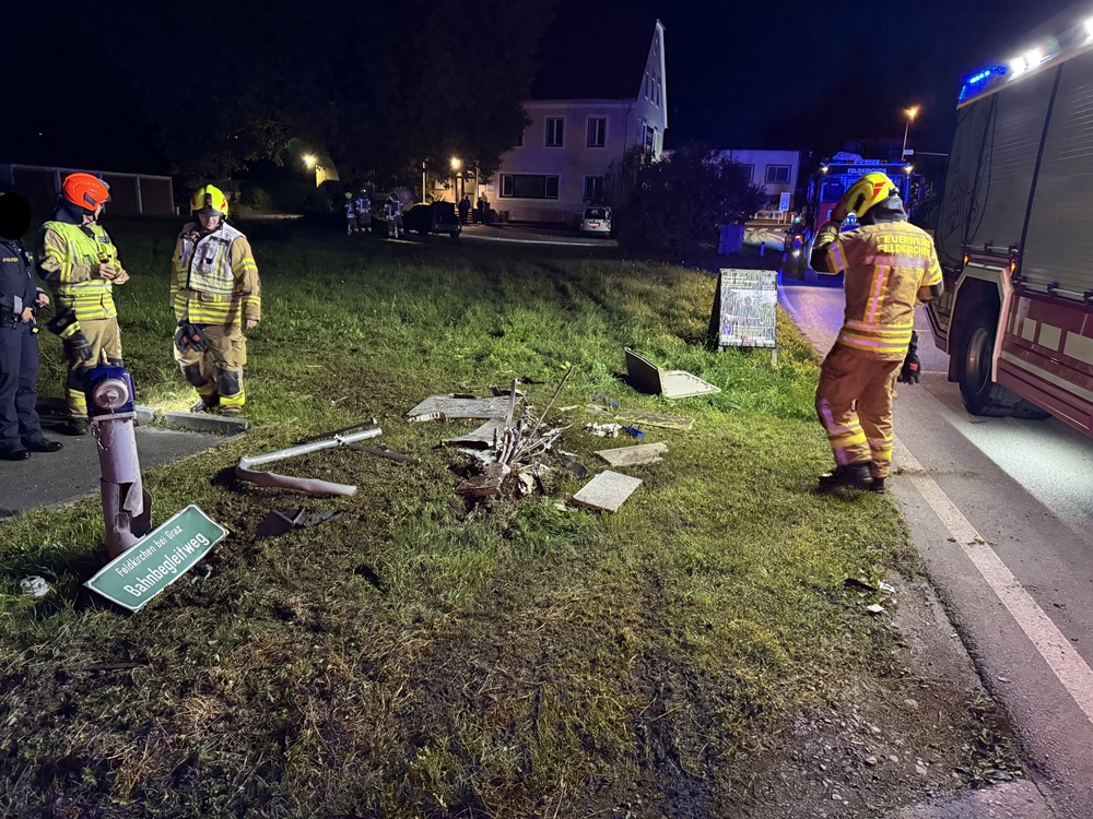 Am 12. Oktober wurde die FF Feldkirchen bei Graz kurz nach Mitternacht zu einem Verkehrsunfall im Ortsgebiet gerufen. Aus ungeklärter Ursache kam ein Fahrzeuglenker von der Straße ab, touchierte einen Hydranten und eine Stromkasten und kam neben der Fahrbahn zum Stehen. Die FF Feldkirchen sicherte die Unfallstelle ab und führte Aufräumarbeiten durch.